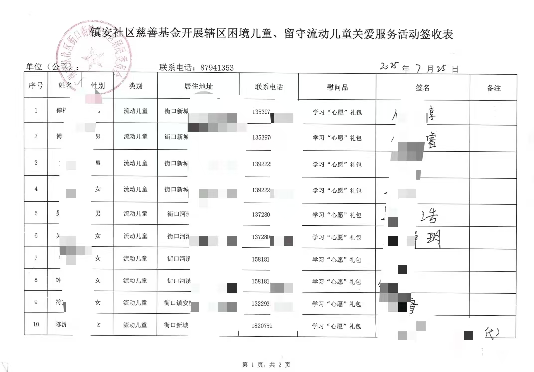 为进一步提升困境儿童和留守流动儿童的关爱服务,镇安社区基金会联合社工通过以活动和走访慰问的形式对辖区13名困境、留守、流动儿童发放学习“心愿”礼包,旨在让儿童们感受社会的关爱与温暖,助力他们学业进步、身心健康,为其成长提供支持与帮助。