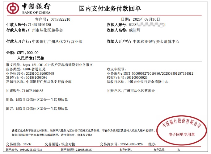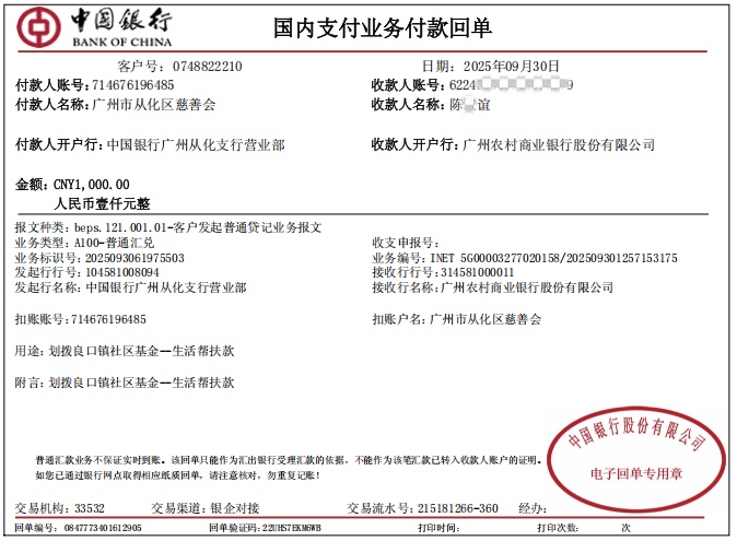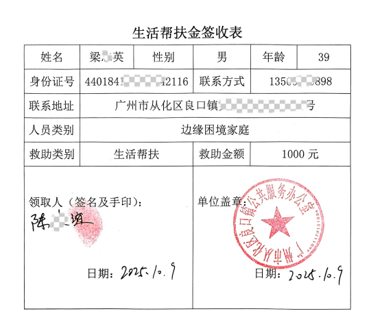 梁*英,男,少沙村人,一家5口人,与父母、妻子及女儿共同居住。父母无业,妻子在四九市一工厂务工,女儿在石岭幼儿园就读中班。服务对象于2024年初查出肝癌并开始接受抗癌治疗,于2025年8月12日去世。服务对象自患病后,给家庭留下50多万的债务,家庭因此疾病和变故导致陷入困境。良口镇社区基金对其进行1000元的生活帮扶。